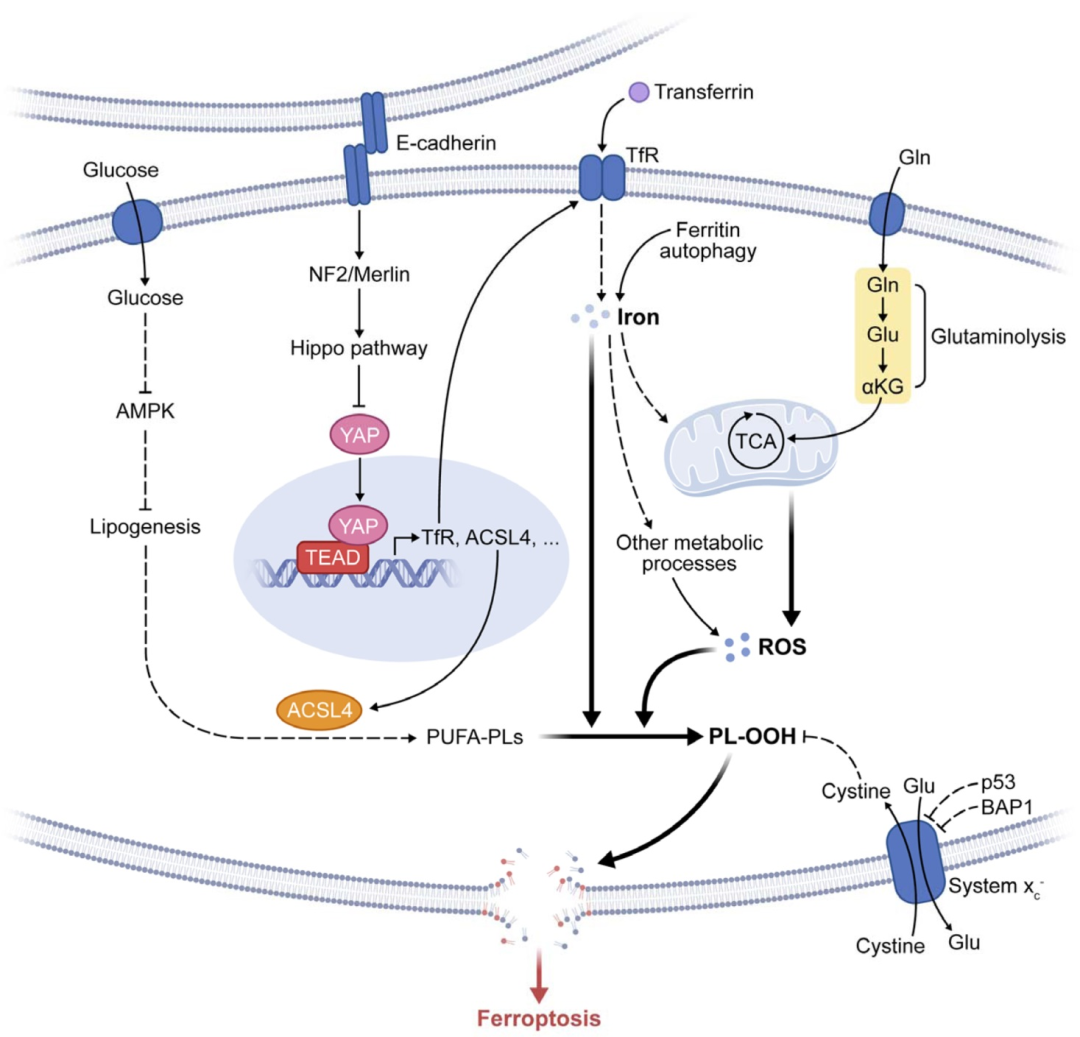从下面这张图我们可以了解到铁死亡中的代谢和细胞信号传导,多个代谢事件和信号通路都参与了铁死亡的调控: