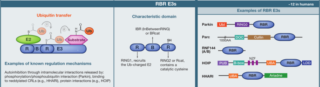 RBR E3连接酶包含特定于每个成员的额外结构域,结构域参与分子内相互作用,使蛋白质处于自身抑制状态。而这种状态可以通过各种机制释放,如磷酸化或蛋白质-蛋白质相互作用。