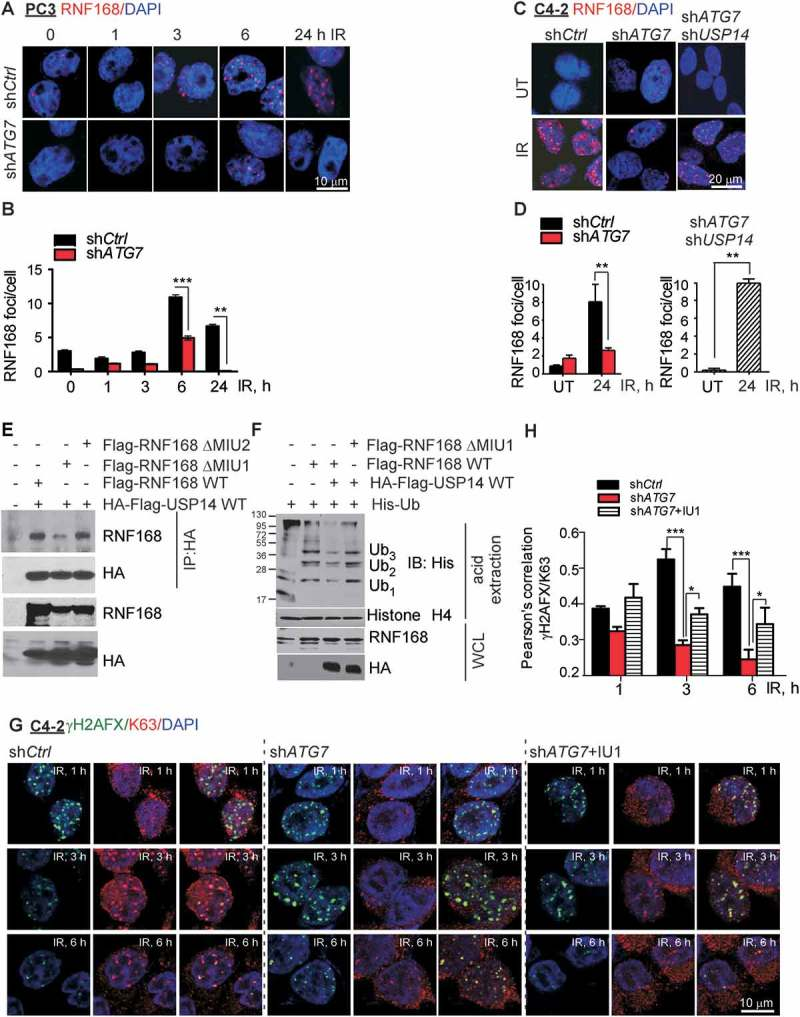 IR治疗可以激活许多肿瘤自噬,而组蛋白H2A和H2AFX/H2AX响应的DNA DSBs泛素化是一种关键的翻译后修饰,具有介导下游信号传导,DNA修复因子募集的作用。因此,作者认为泛素化和去泛素化信号可以有效动态调节DDR。