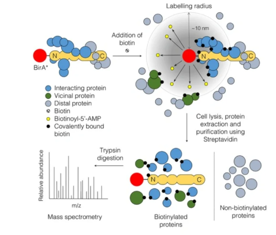 原理:通过将生物素连接酶(BirA)与“诱饵”蛋白融合表达,加入适量生物素,融合蛋白的相互作用以及附近环境中的蛋白质会被生物素化。然后通过链霉亲和素或Strep-Tactin进行亲和纯化,将被生物素化的蛋白质从细胞裂解液中富集出来,产物做质谱鉴定。