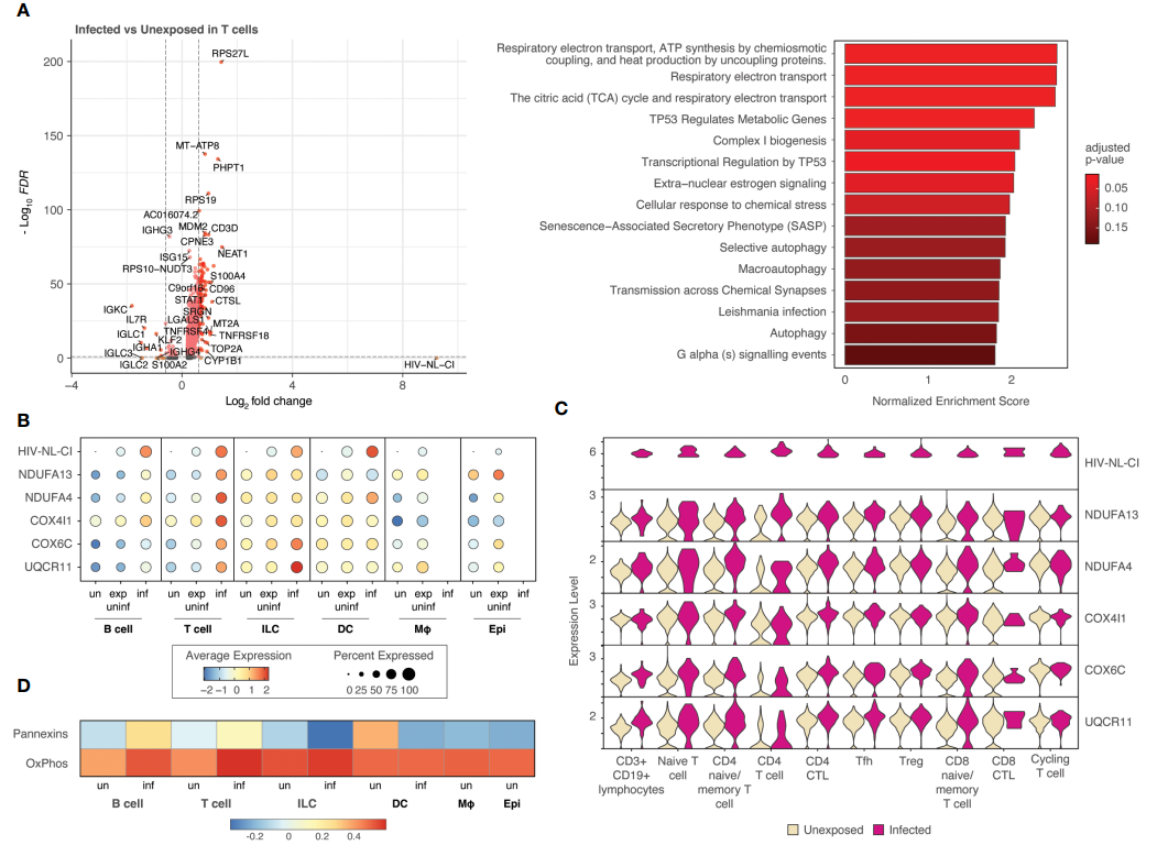 作者将实验组分为HIV暴露与未暴露两组,并测定了暴露后感染与未感染细胞分群中各类细胞的占比。火山图显示了感染细胞和未感染细胞之间基因表达的倍数变化。