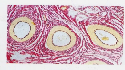 用途及原理:Gomorl法能明确展示血管壁的层次结构,特别是其内、中、外层的弹力膜。醛品红对特定蛋白质和黏多糖有高度亲和力,能很好地结合弹力纤维,并同时显示肥大细胞颗粒、脂褐素、嗜酸性细胞等。它能将弹性纤维染成深浅不一的紫色,黏液呈现紫色,而背景则呈现出不同程度的黄色。